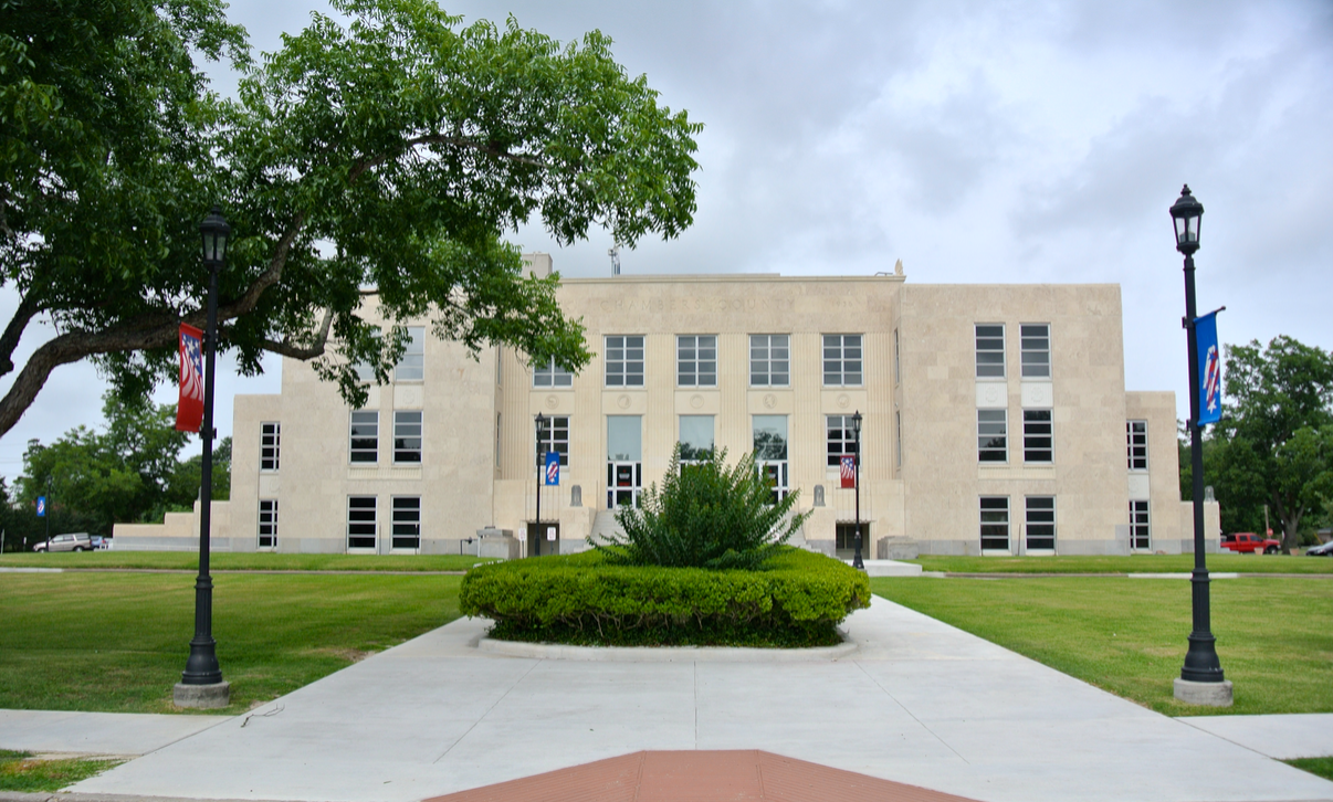 The main façade of the Chambers County Courthouse faces west towards Washington Avenue.